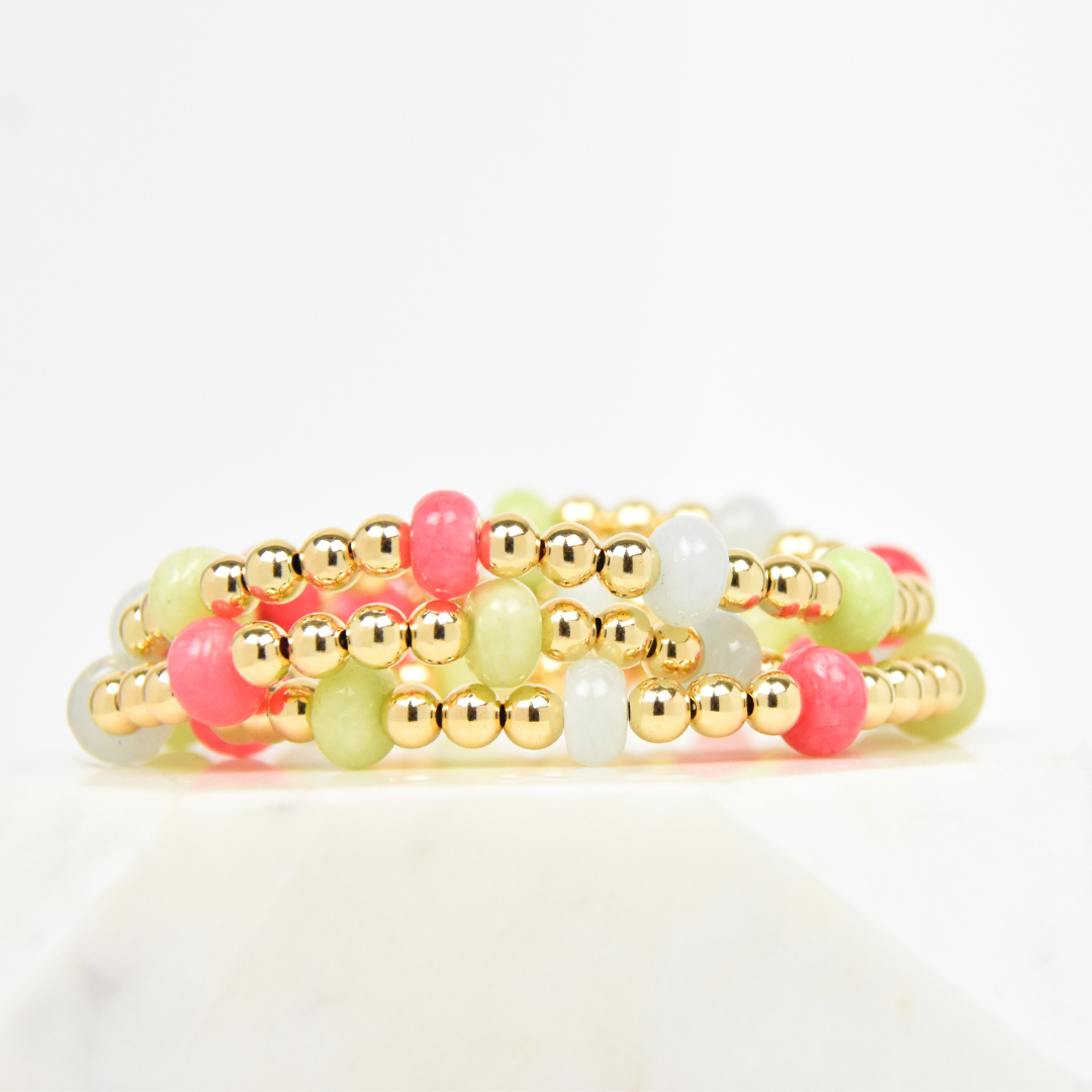5x8mm smooth rondelle jade beads in light blue, lime green, and pink with 5mm 14k gold filled beads between, on elastic for ease.