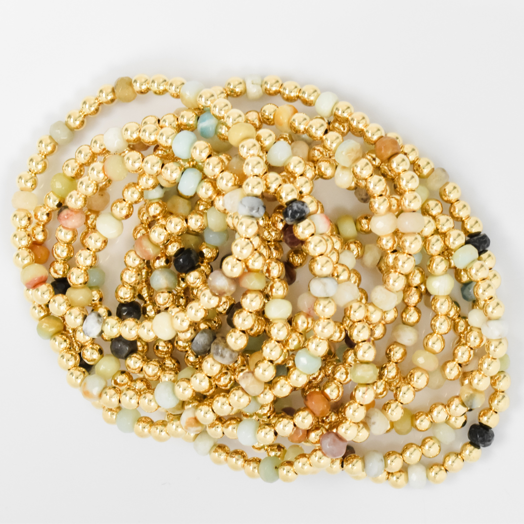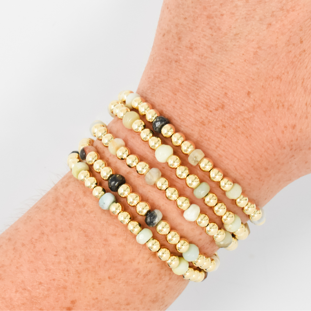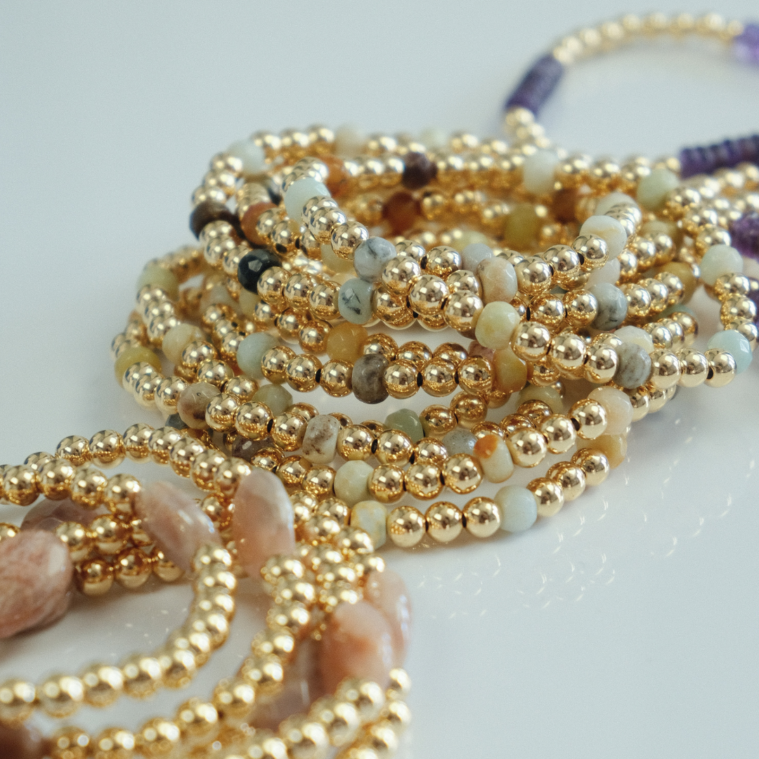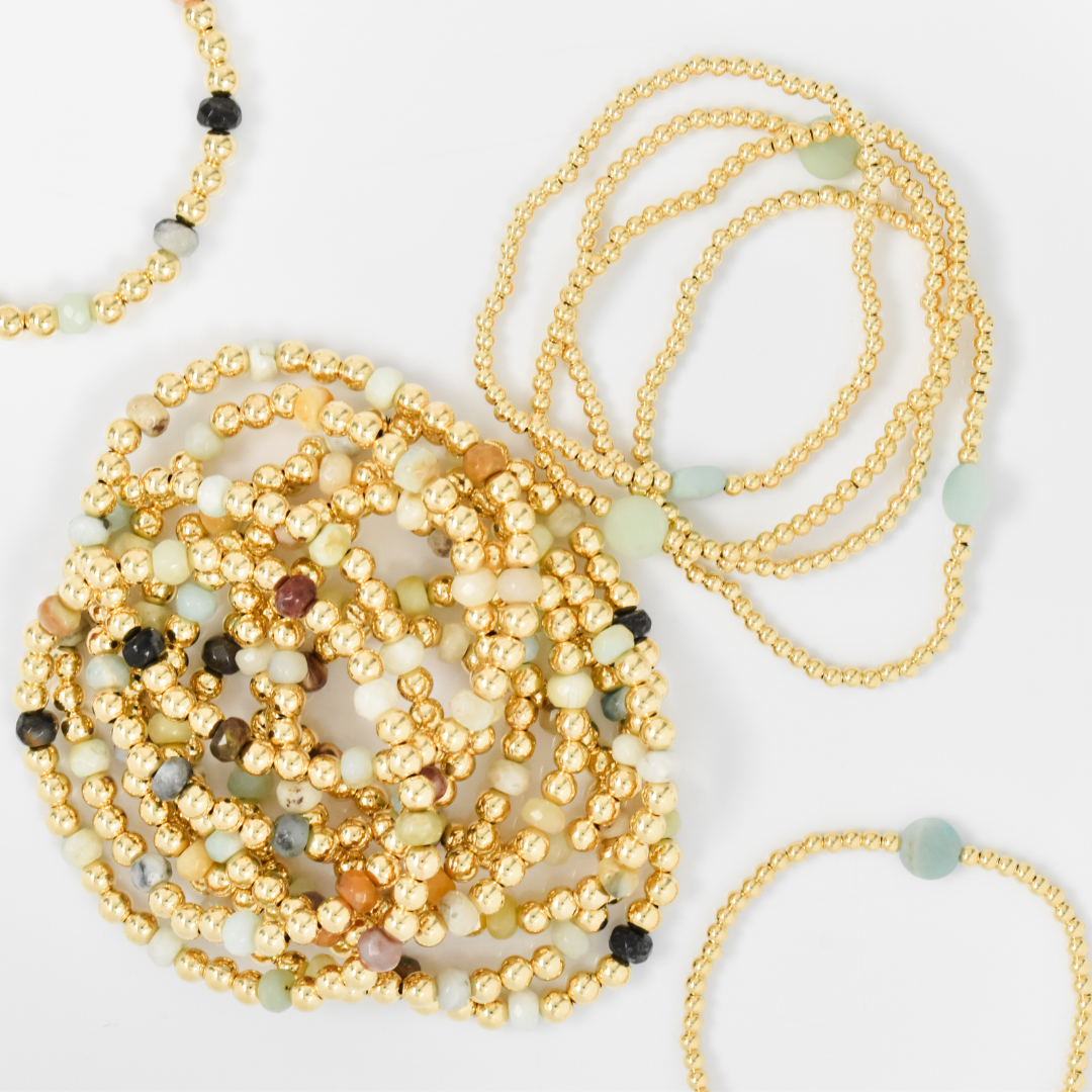 Roll bracelets on to maintain the integrity of the bracelet and prevent breaking/stretching out of the elastic. Natural stones have size and color variations.
