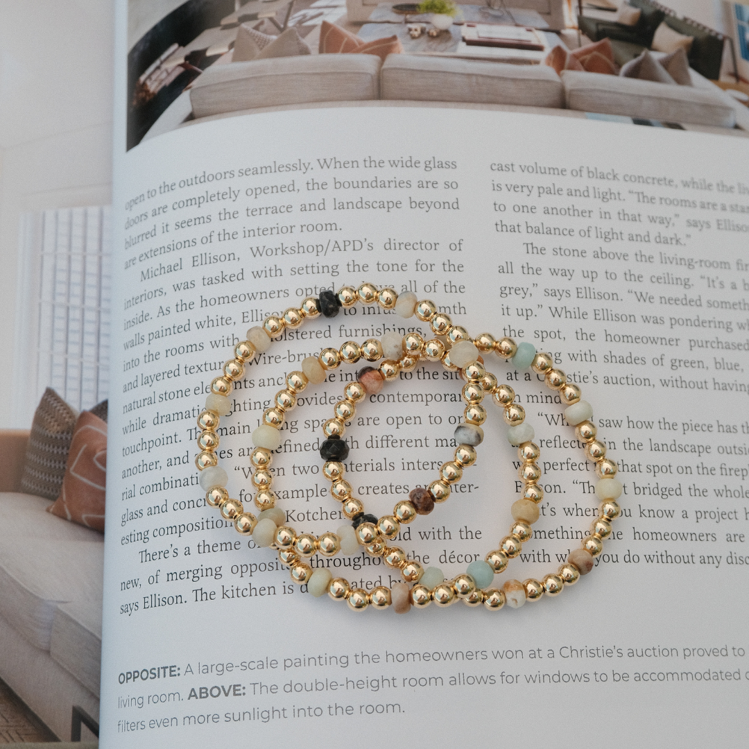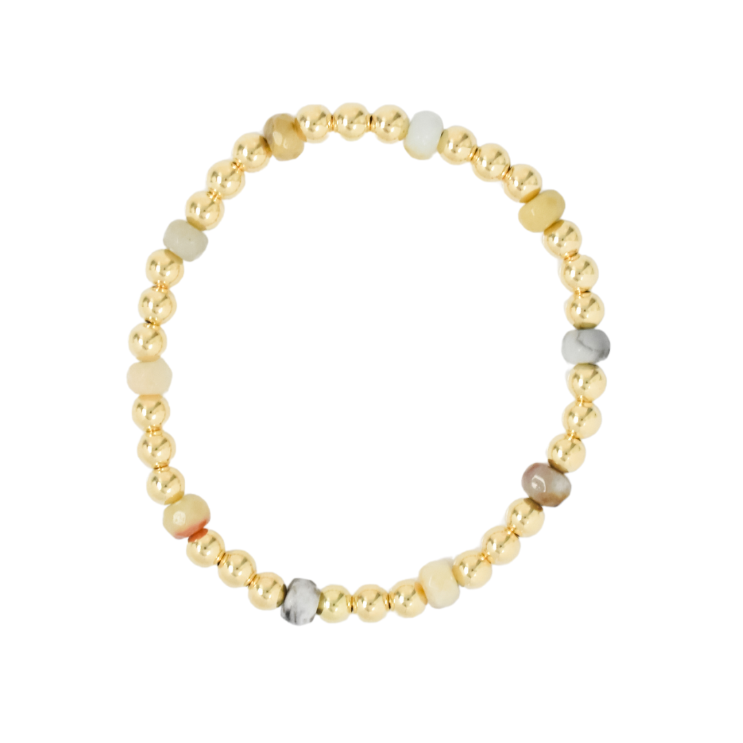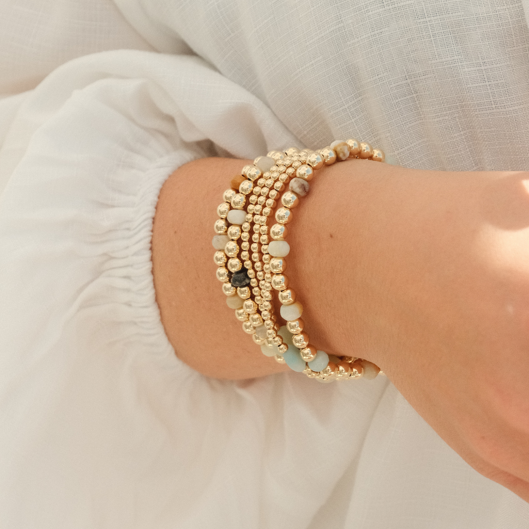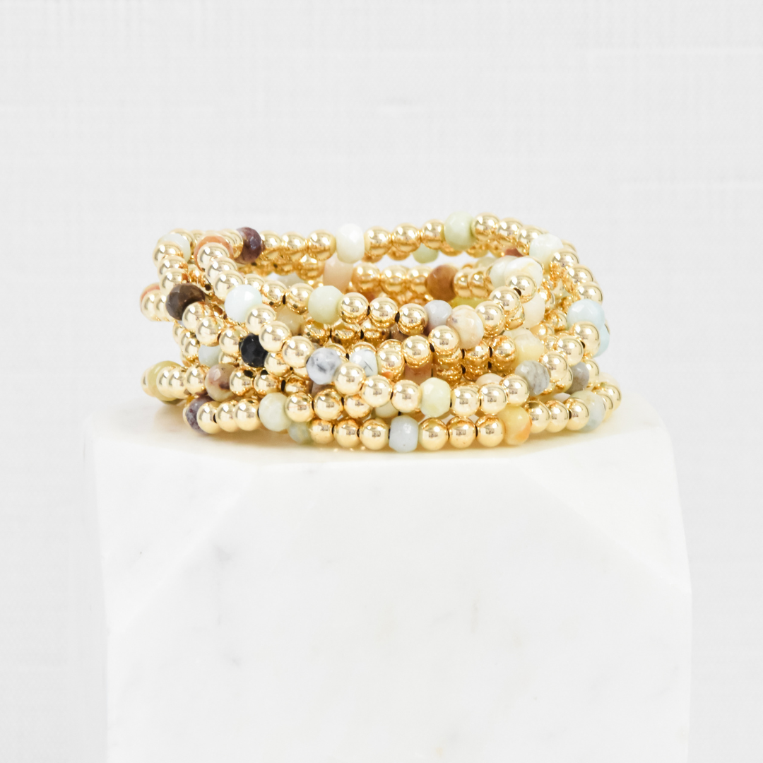 Roll bracelets on to maintain the integrity of the bracelet and prevent breaking/stretching out of the elastic. Natural stones have size and color variations.