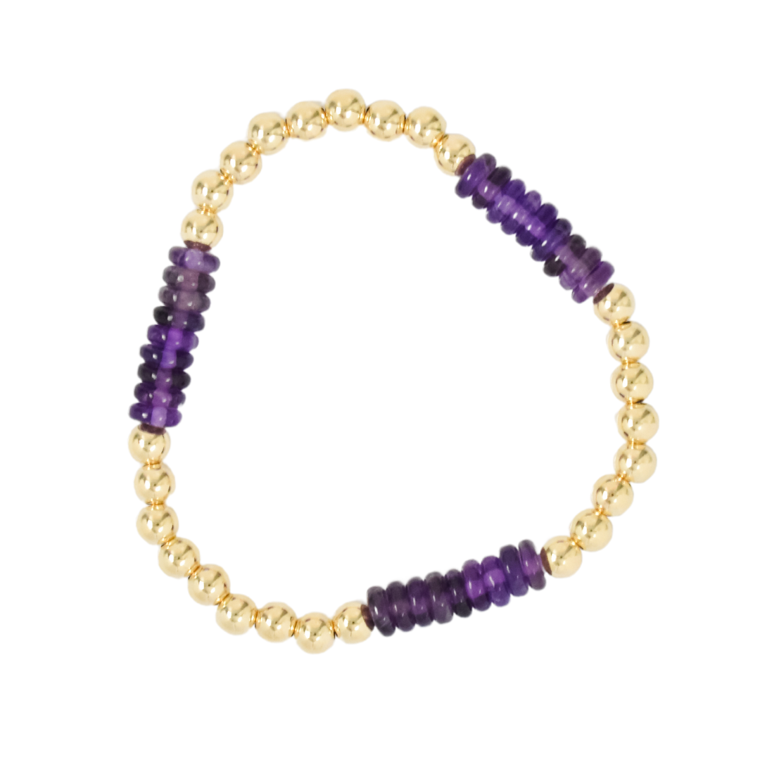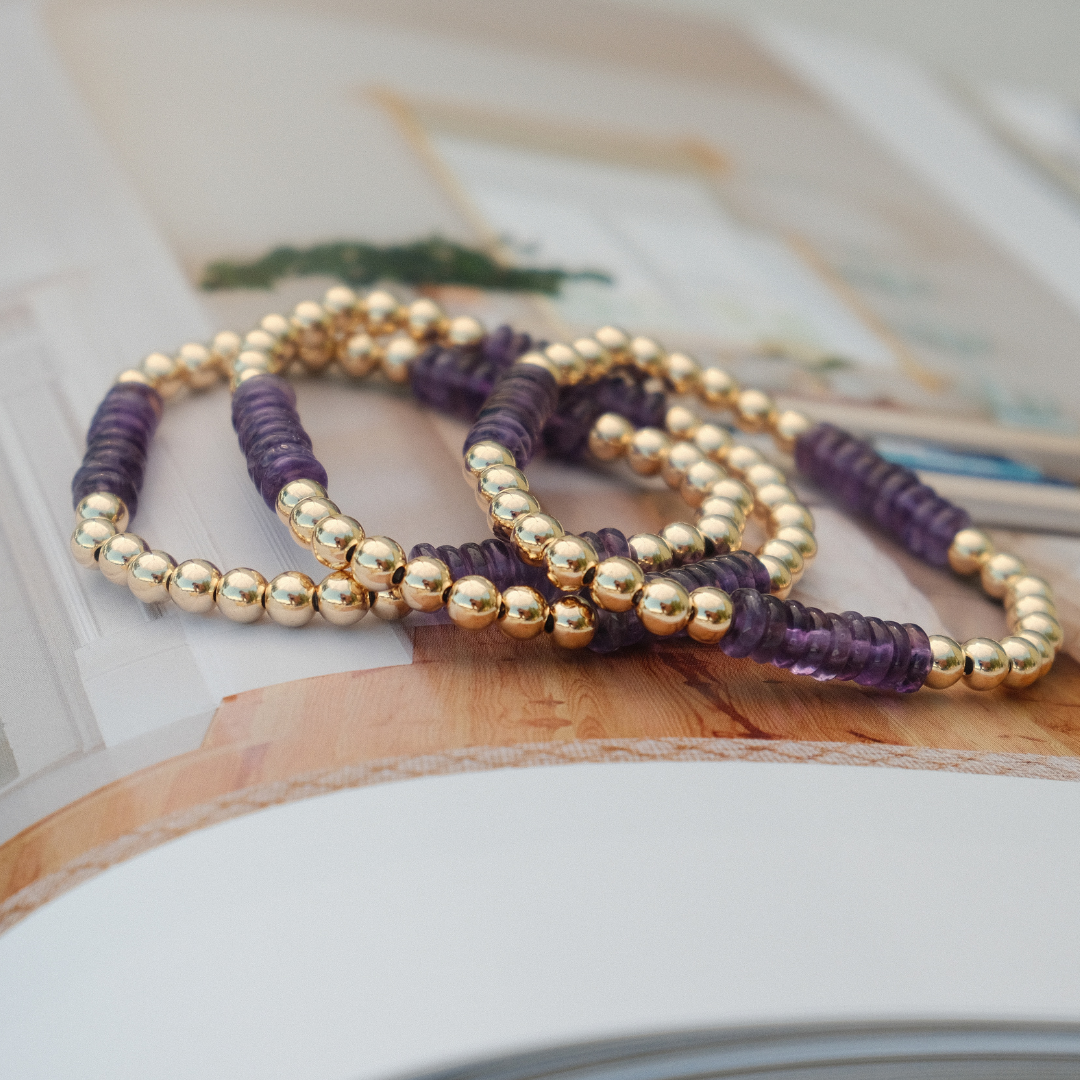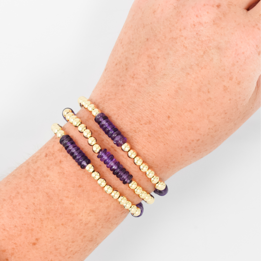 3 groupings of 6mm natural amethyst heishi beads alternating with 5mm 14k gold filled beads.