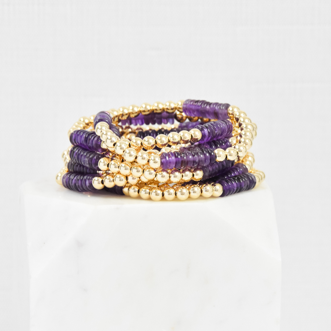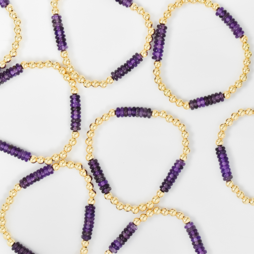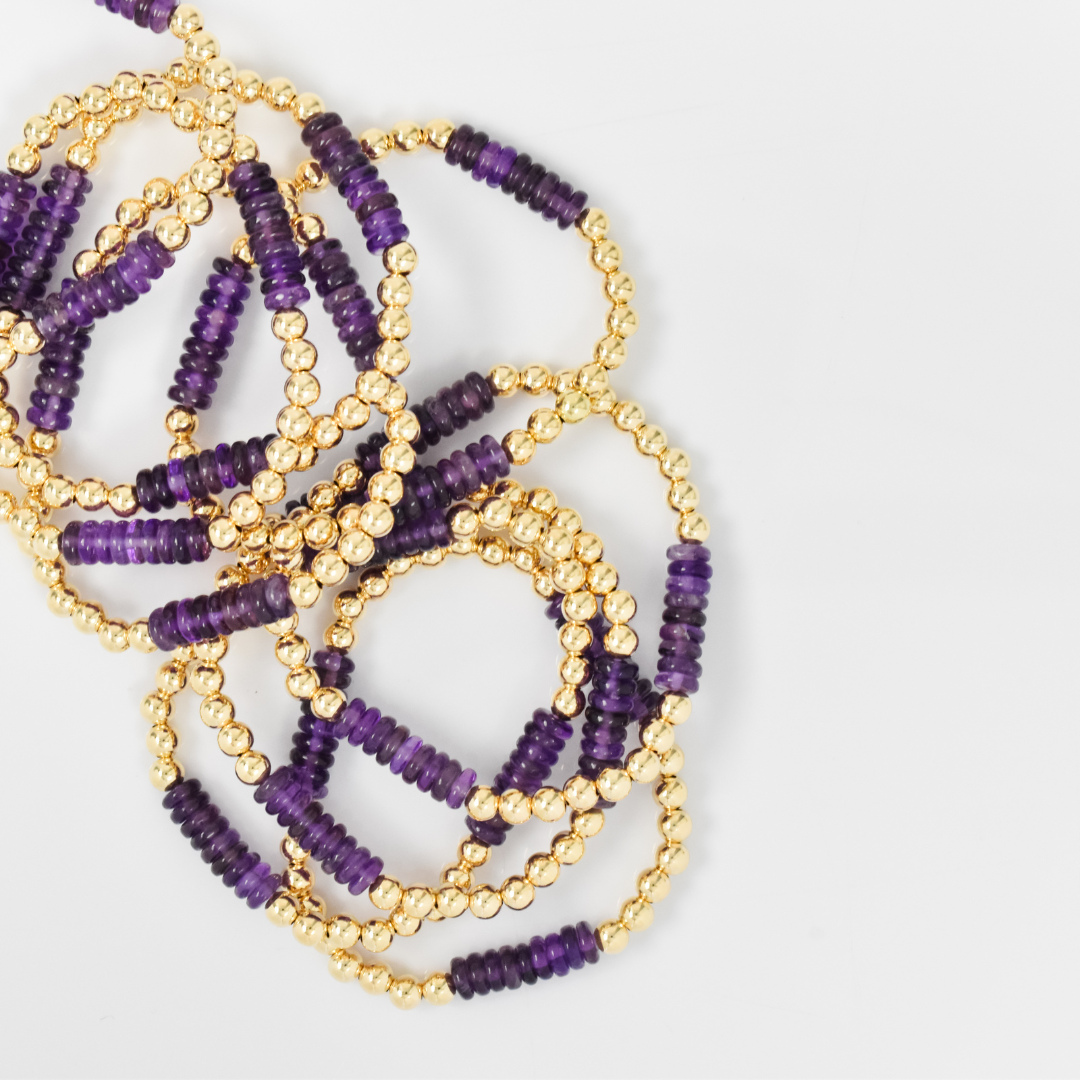 3 groupings of 6mm natural amethyst heishi beads alternating with 5mm 14k gold filled beads.