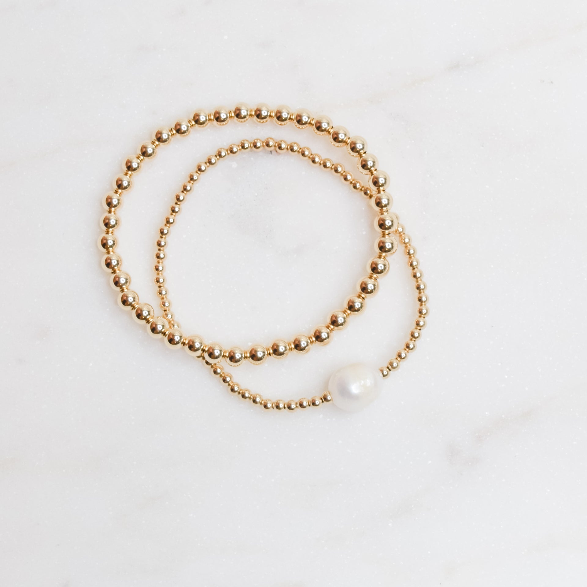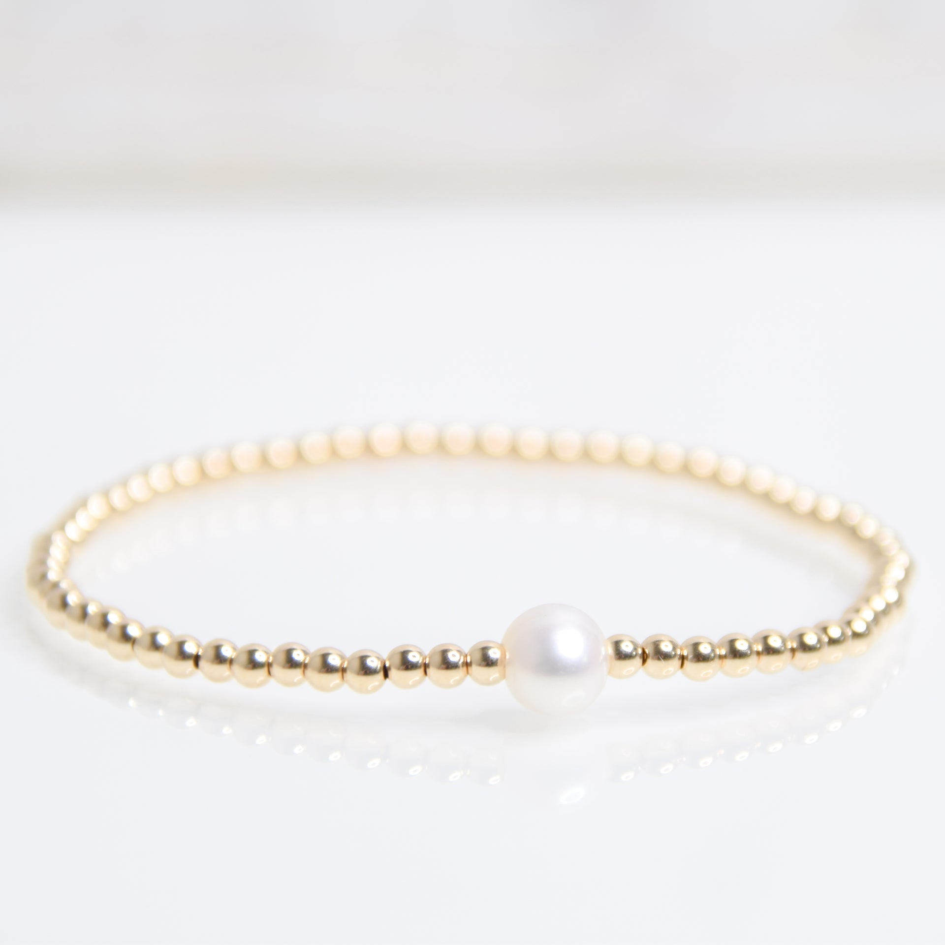 7" / 3mm 14k gold filled beads with freshwater pearl, on stretch string for ease