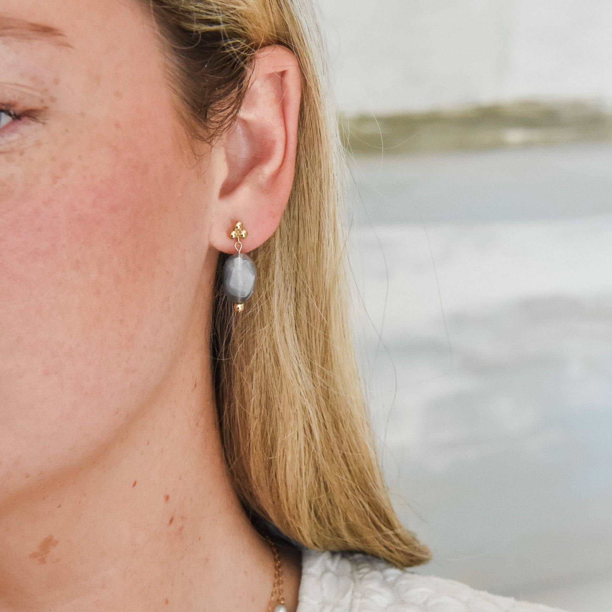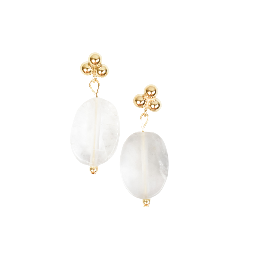 10x14mm Flat oval natural cloudy quartz gemstone on a 3 ball 14k gold filled post.