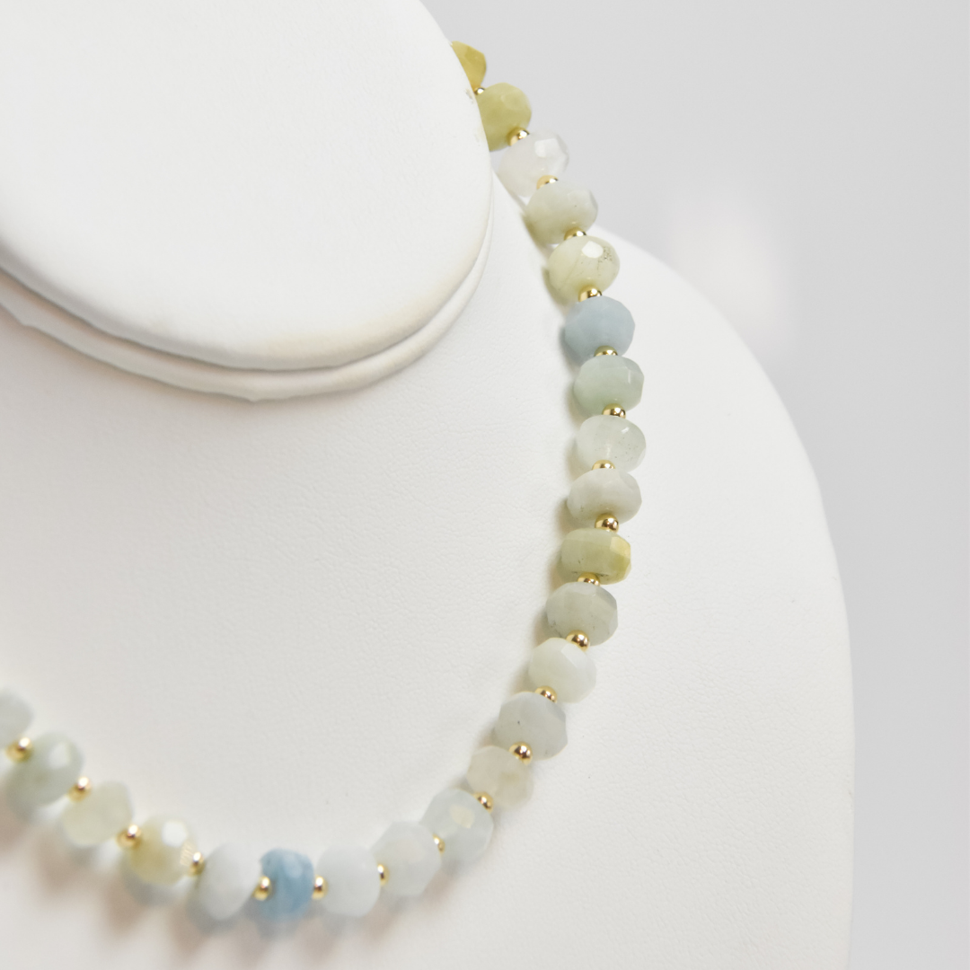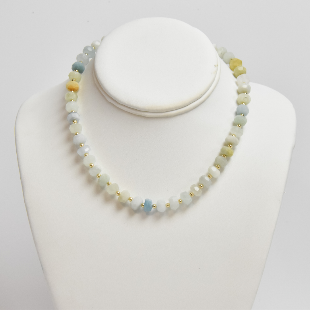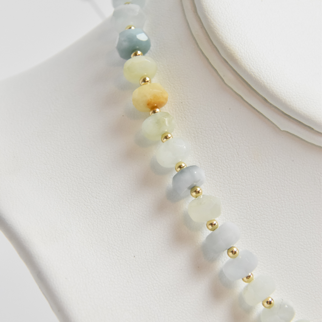 6x9mm Blue, yellow, and green aquamarine beads alternating with 3mm 14k gold filled beads with 3" Delicate Chain extension and spring ring closure.