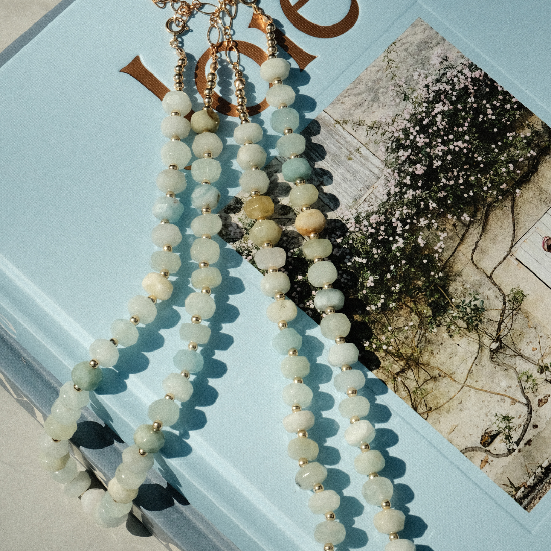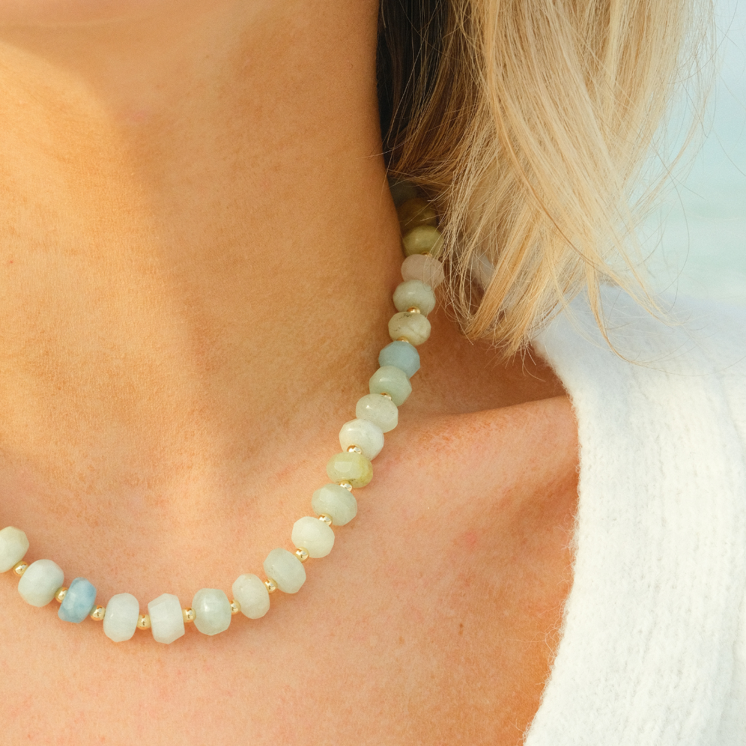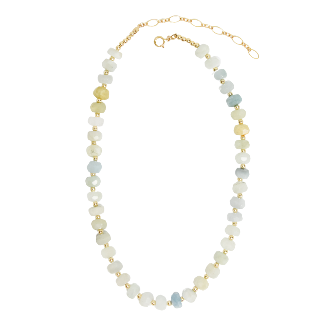 6x9mm Blue, yellow, and green aquamarine beads alternating with 3mm 14k gold filled beads with 3" Delicate Chain extension and spring ring closure.