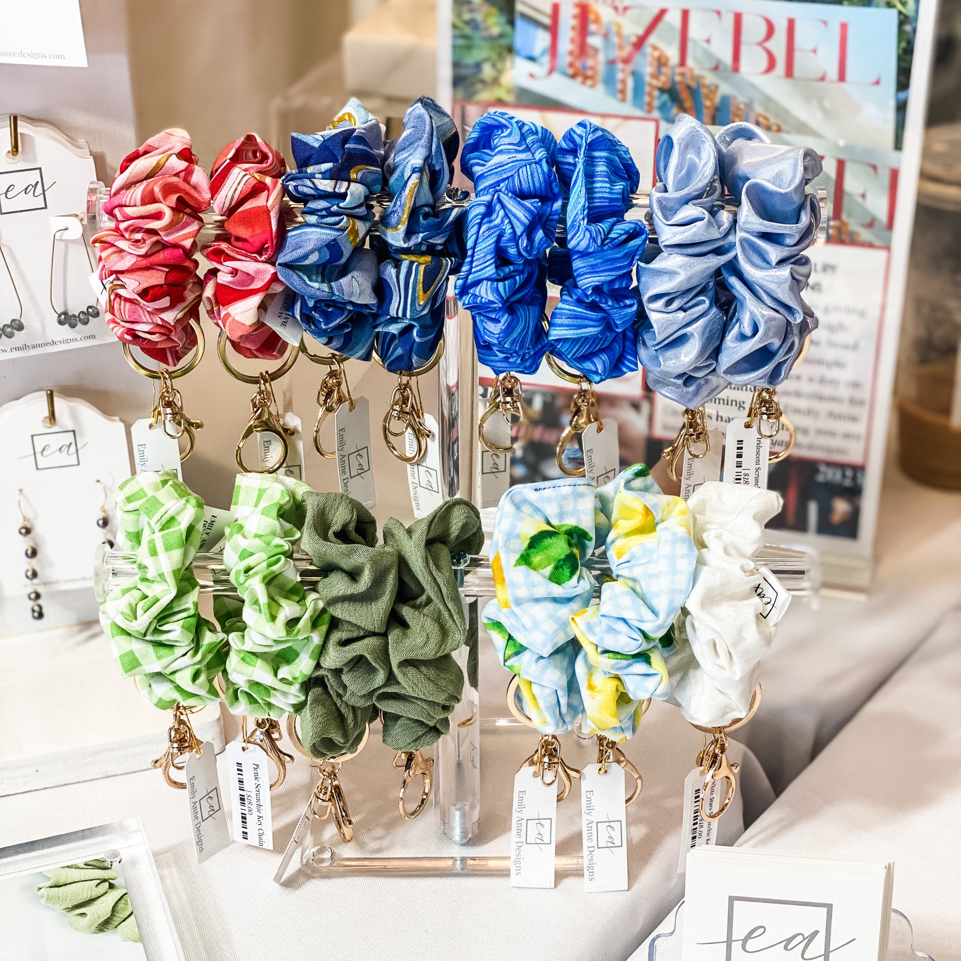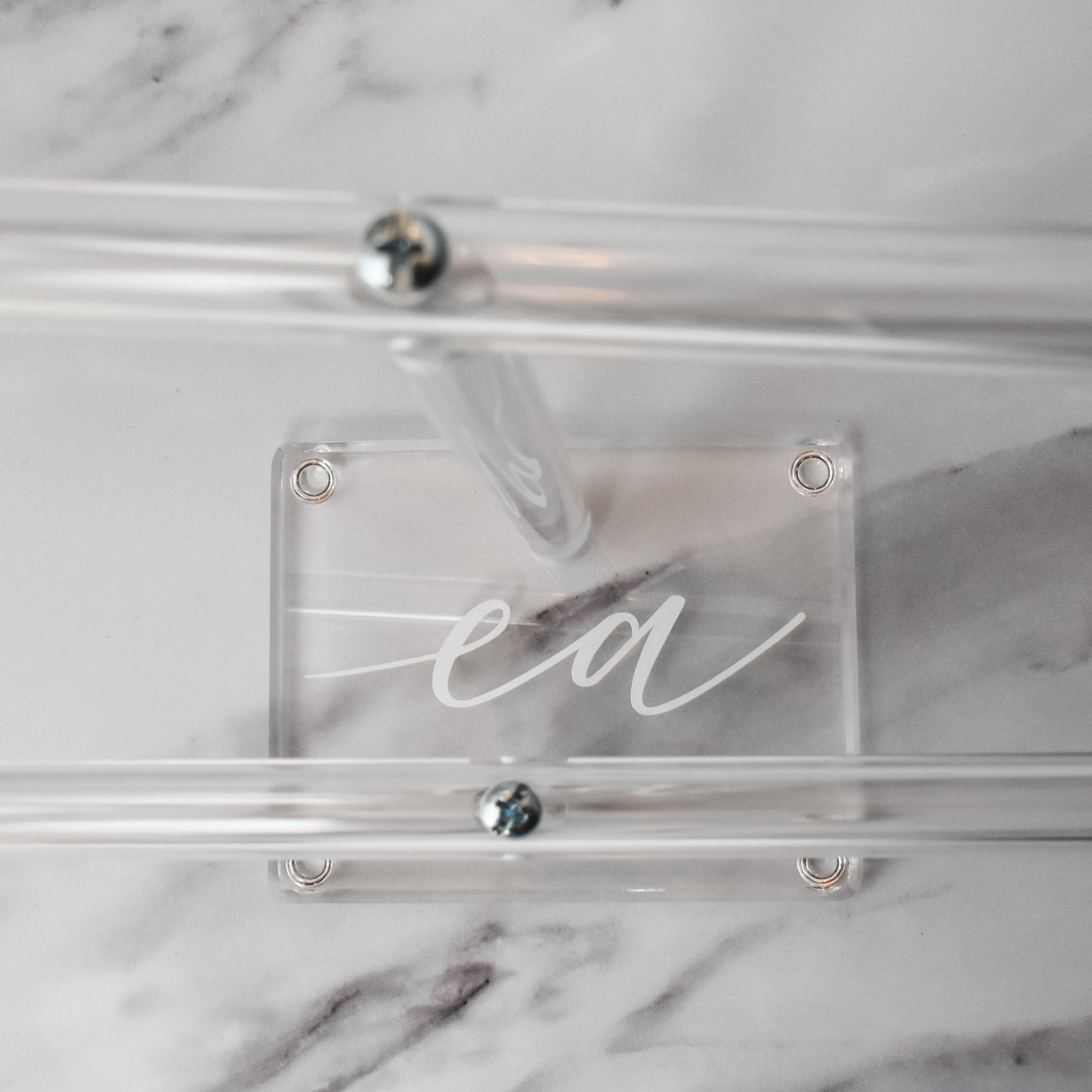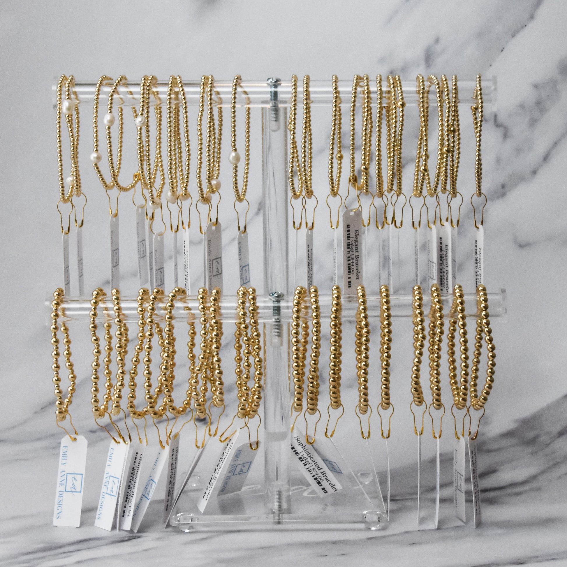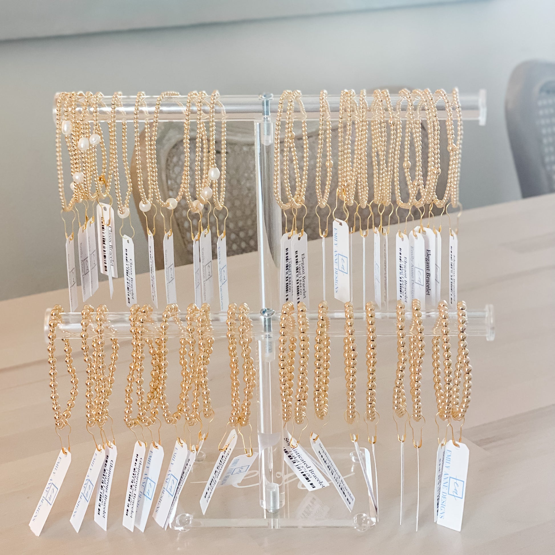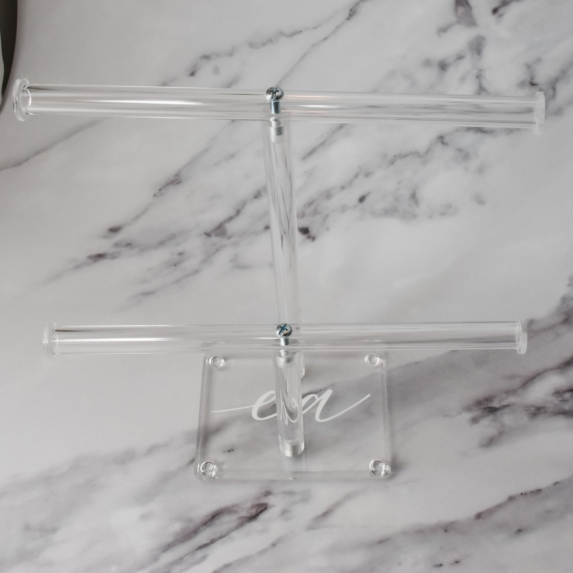 Acrylic double bar display for bracelets or Scrunchie Key Chains with white EA logo. Perfect for countertop displays.