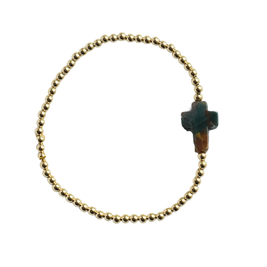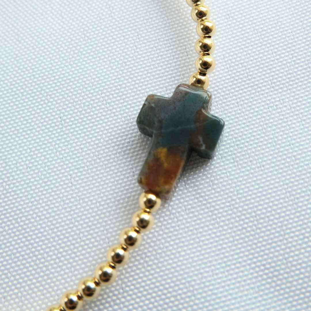 Stone cross beading will remind you to always hold faith! Each cross is unique in color and pattern. Indian Agate is a stone that signifies fortitude. Stone is a dark green and brown - each stone is unique in color and look.