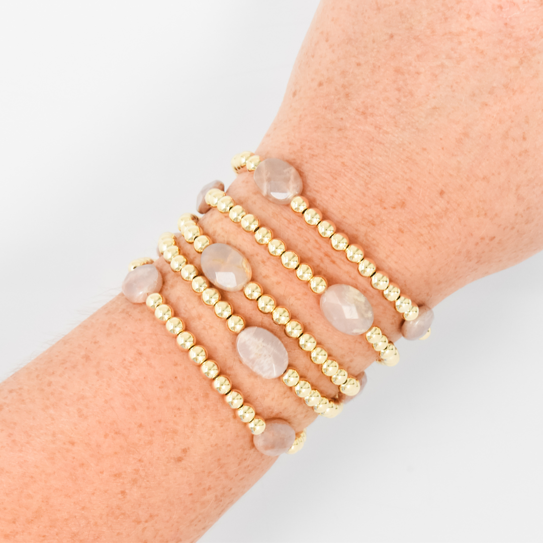 Roll bracelets on to maintain the integrity of the bracelet and prevent breaking/stretching out of the elastic. Natural stones have size and color variations.