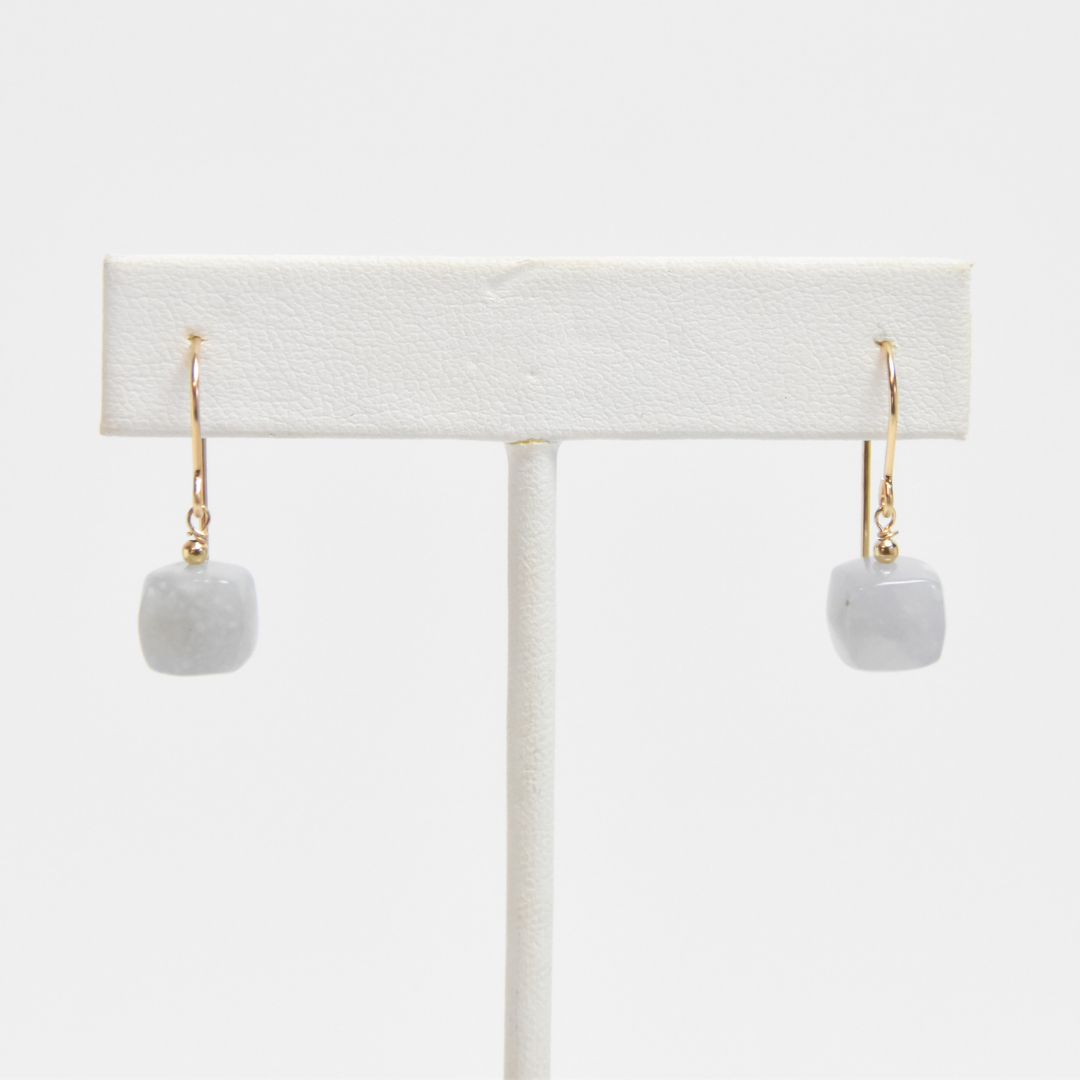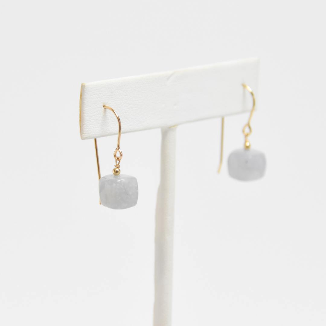 9-10mm light blue chalcedony cube beads on a French ear wire. Each bead is unique, but matched as well as possible.