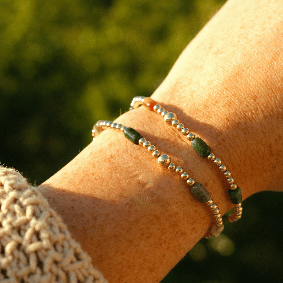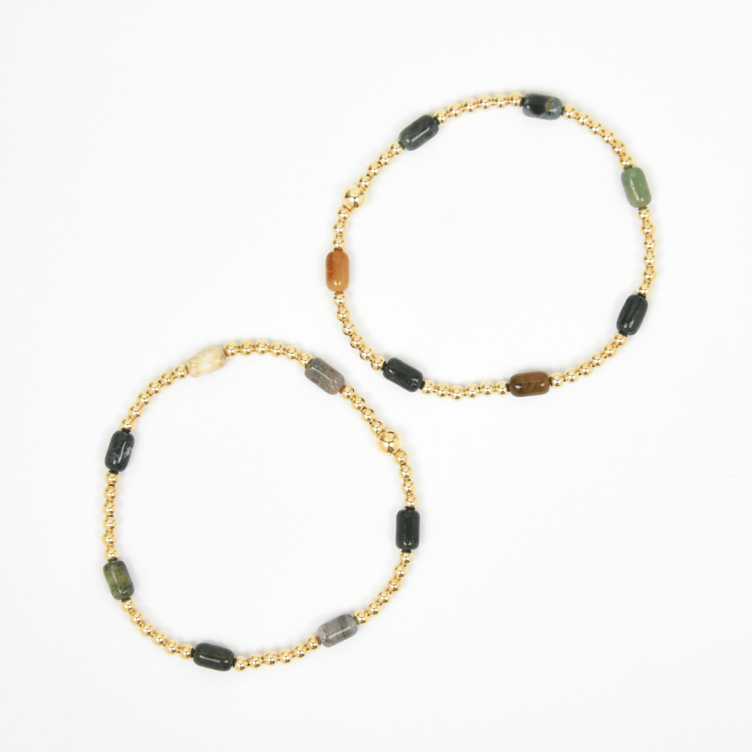 Roll bracelets on to maintain the integrity of the bracelet and prevent breaking/stretching out of the elastic. Natural stones have size and color variations.