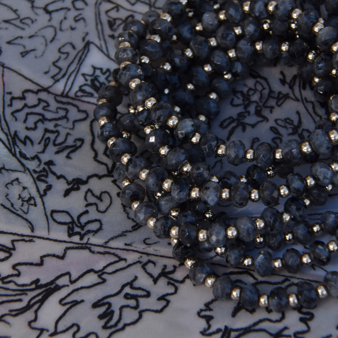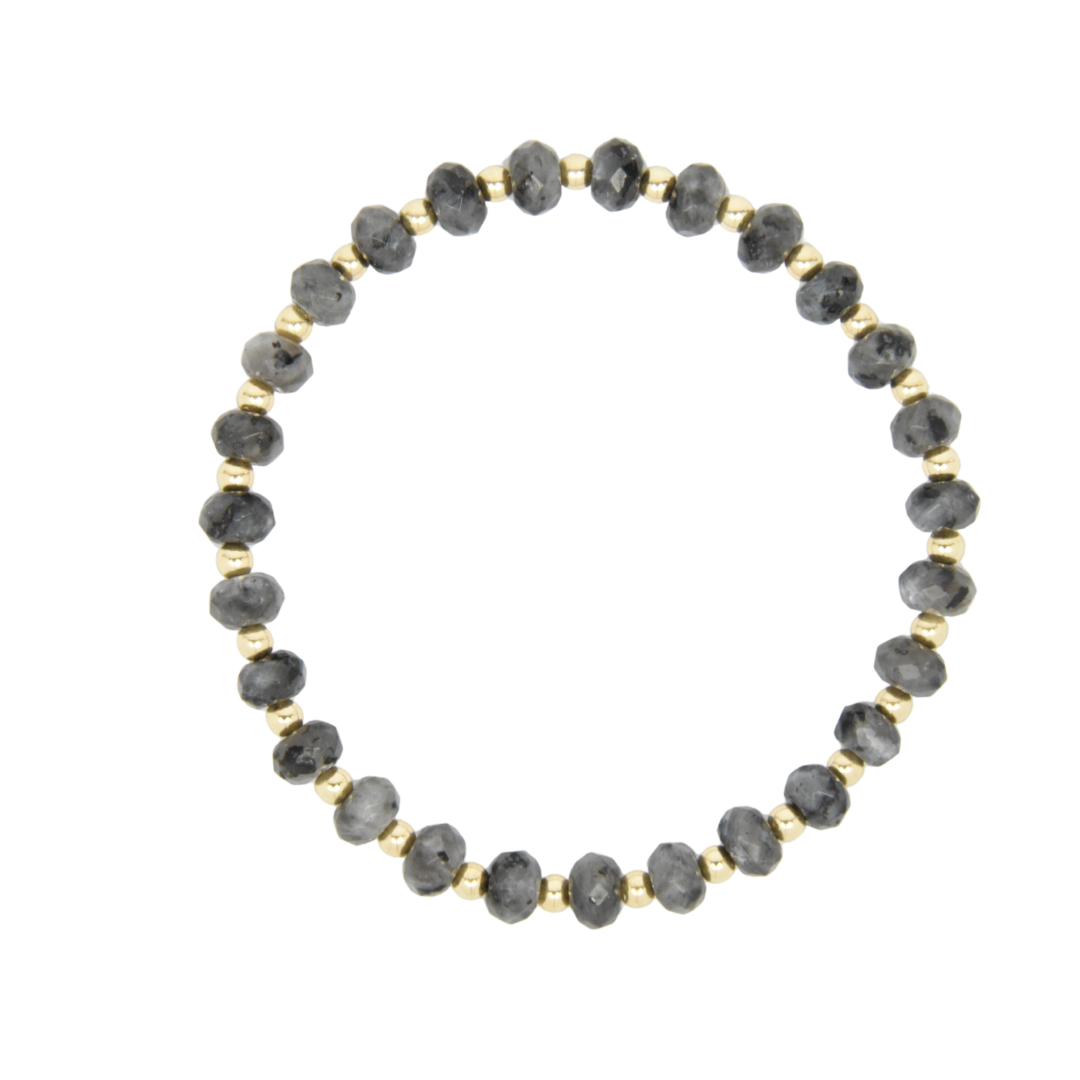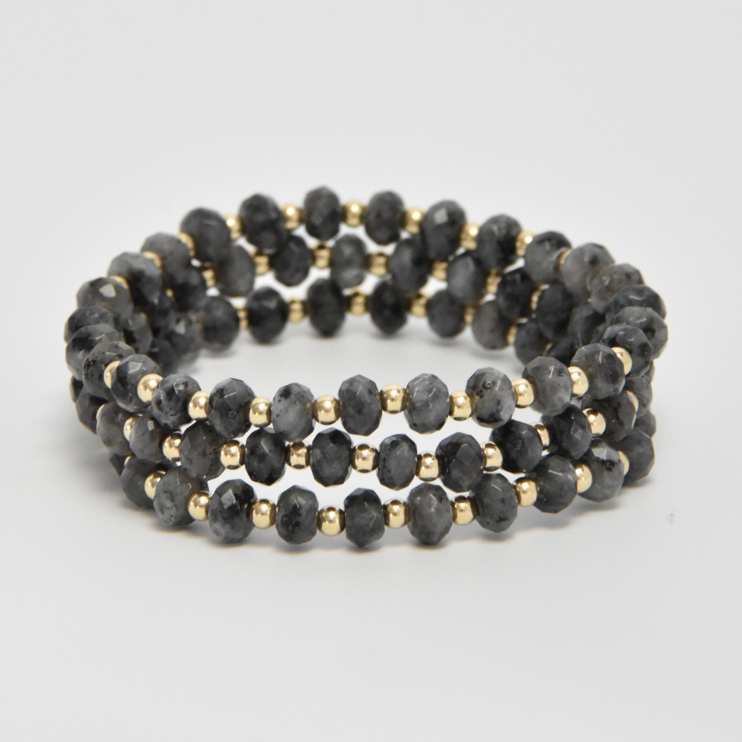 7" / 3mm gold filled beads alternating with 6mm faceted rondelle natural Black Norway Larvikite on elastic for ease.