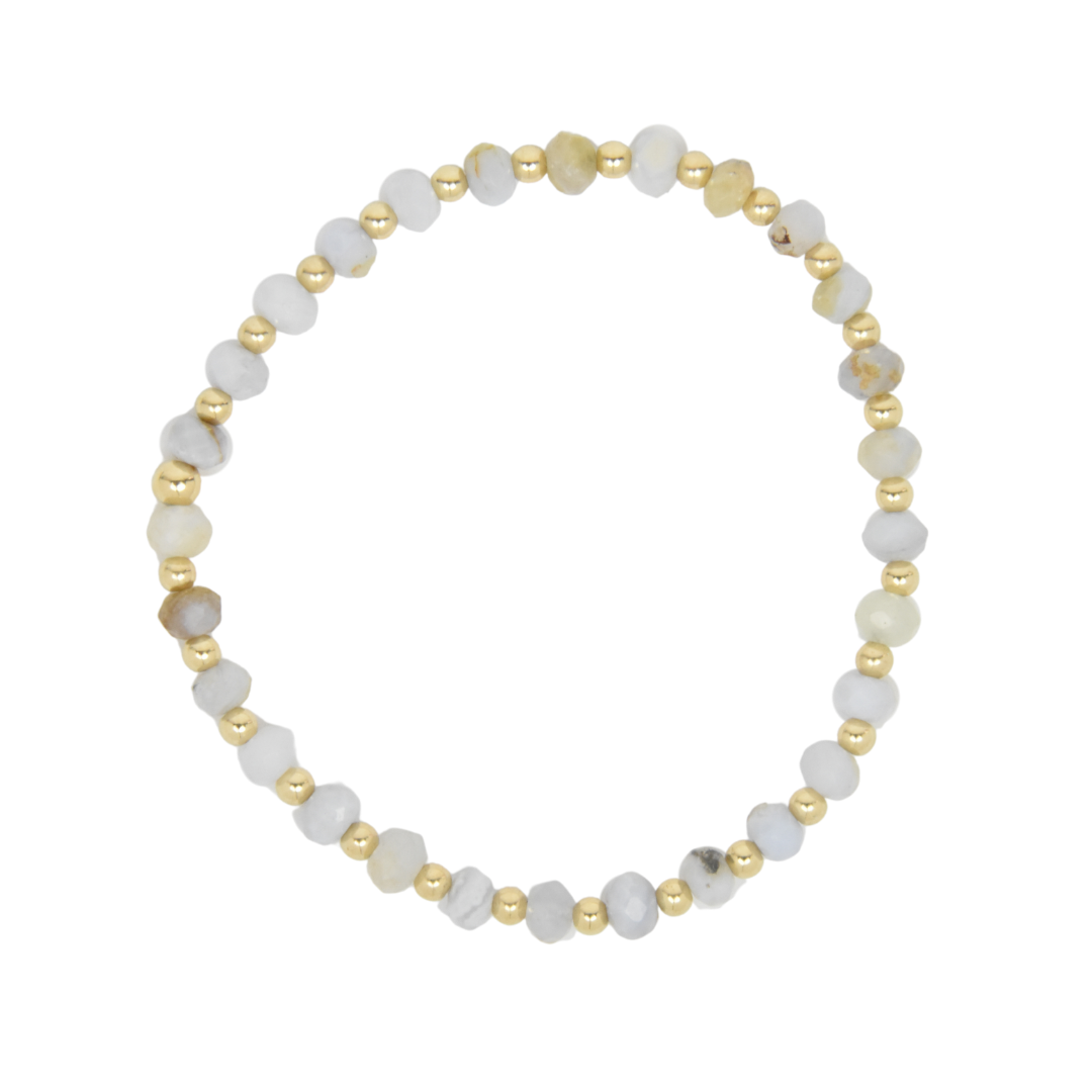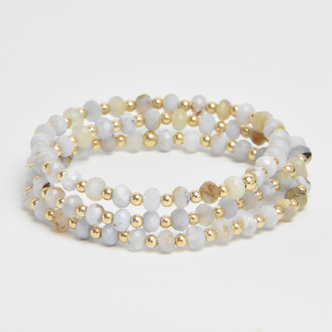7" / 3mm gold filled beads alternating with 5mm faceted rondelle natural Blue Chalcedony on elastic for ease.