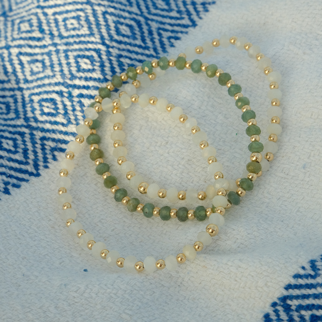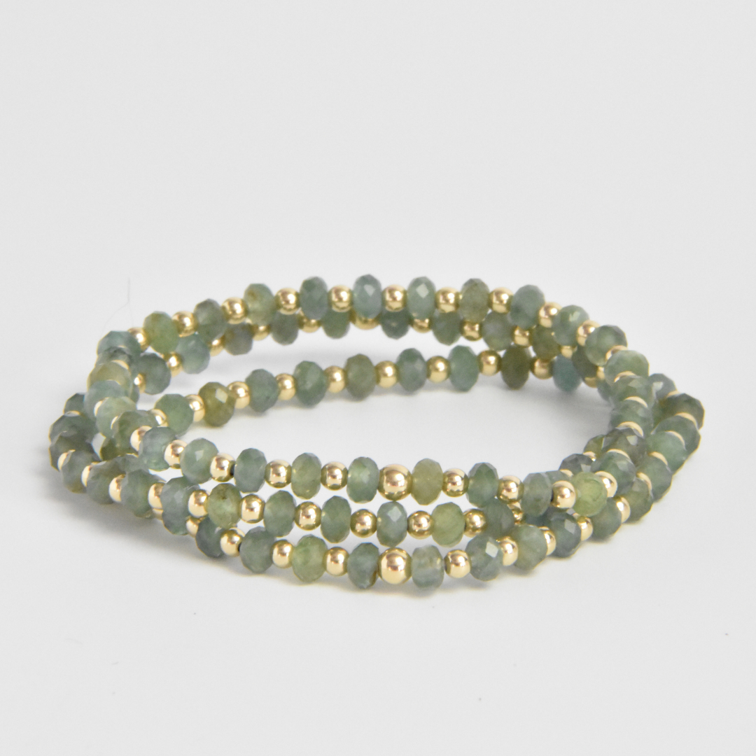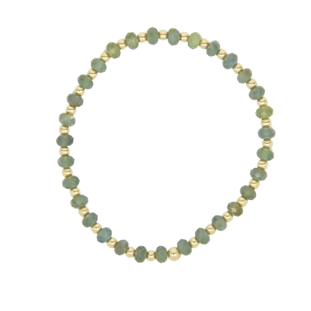 7" / 3mm gold filled beads alternating with 5mm faceted rondelle natural Green Apatite on elastic for ease.