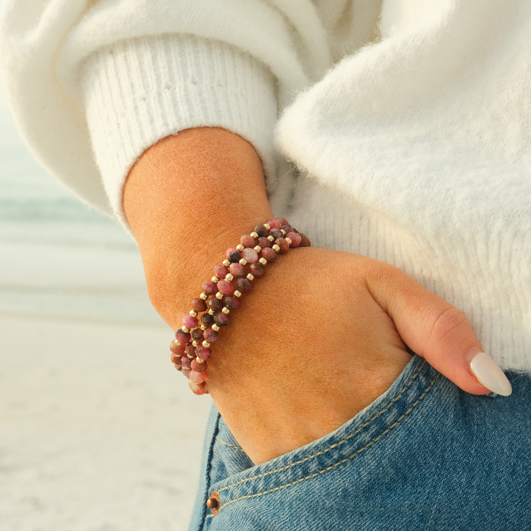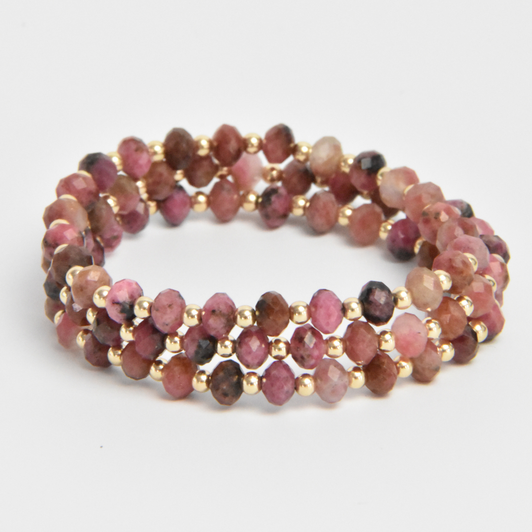 7" / 3mm gold filled beads alternating with 6mm faceted rondelle natural Red Thulite on elastic for ease.