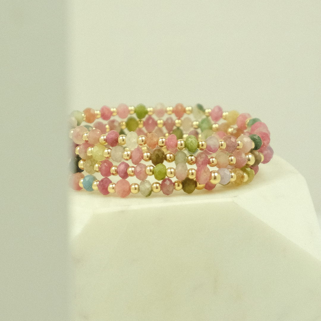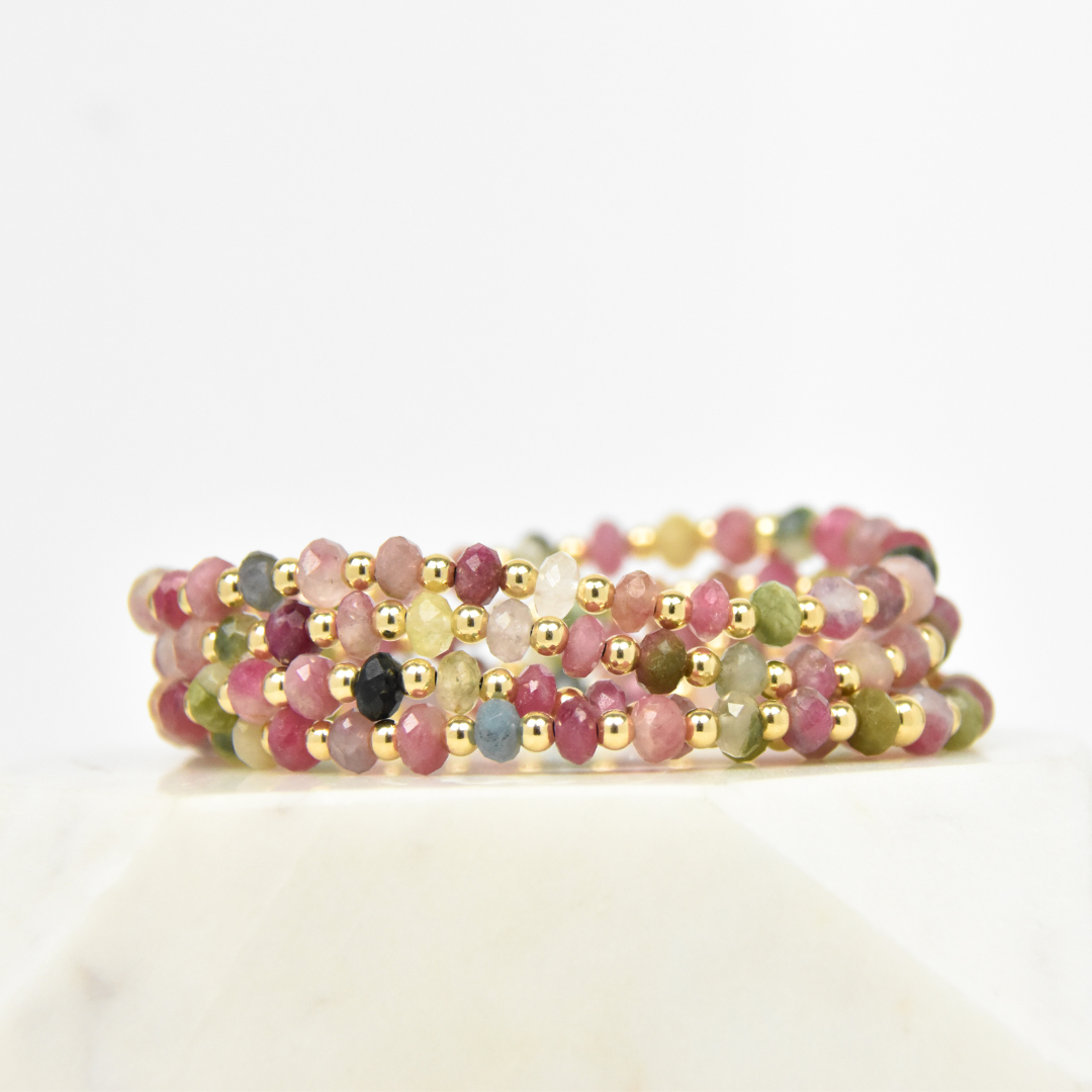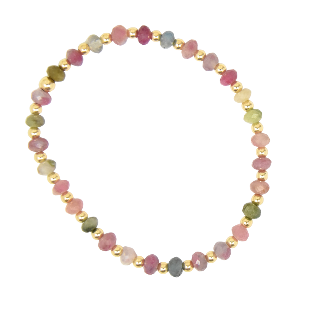 7" / 3mm gold filled beads alternating with 5mm faceted rondelle natural watermelon tourmaline on elastic for ease.