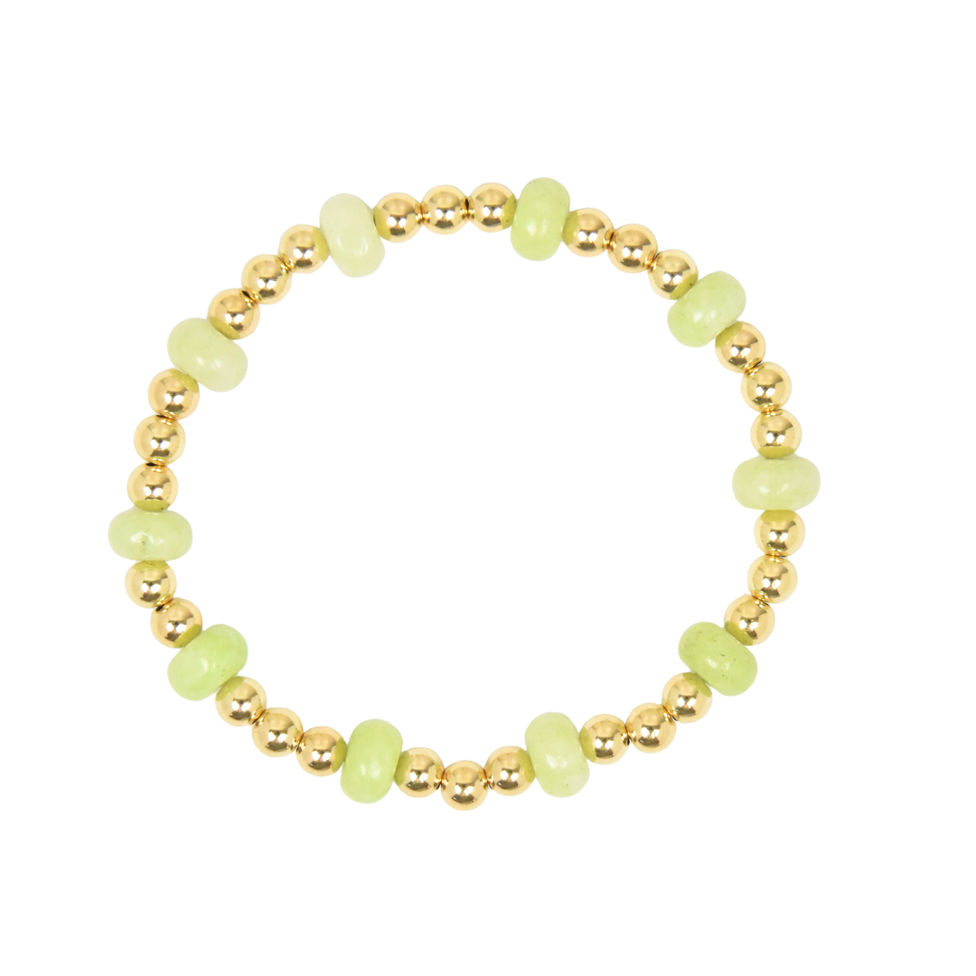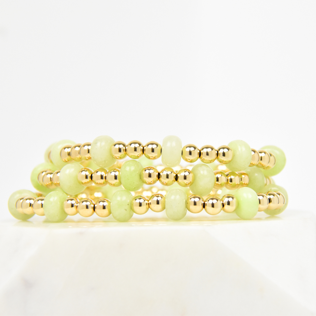 5x8mm smooth rondelle light blue jade beads with 5mm 14k gold filled beads between, on elastic for ease.