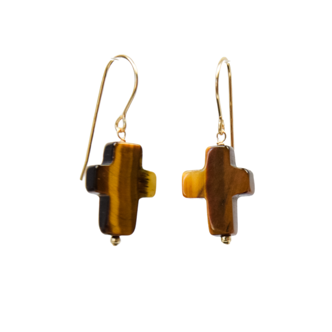 Natural stone cross earrings to remind you that placing your hope and faith in Him is the best way. Tiger's eye stones symbolize confidence and courage with a grounding, protective energy used to take action.