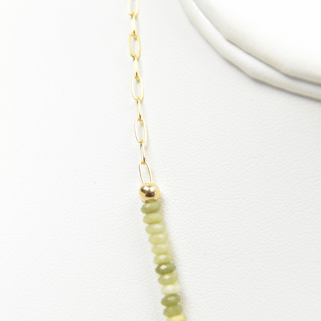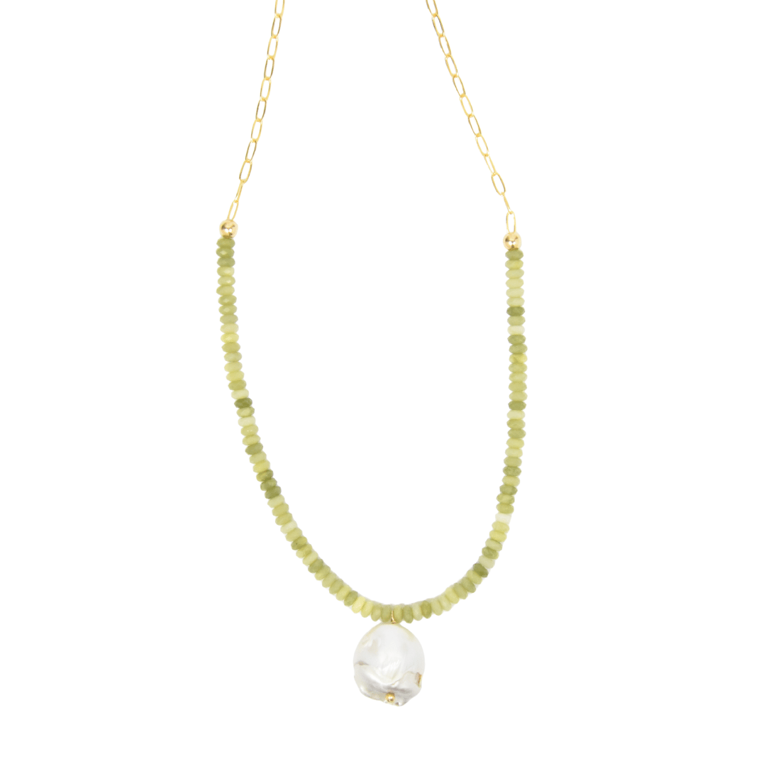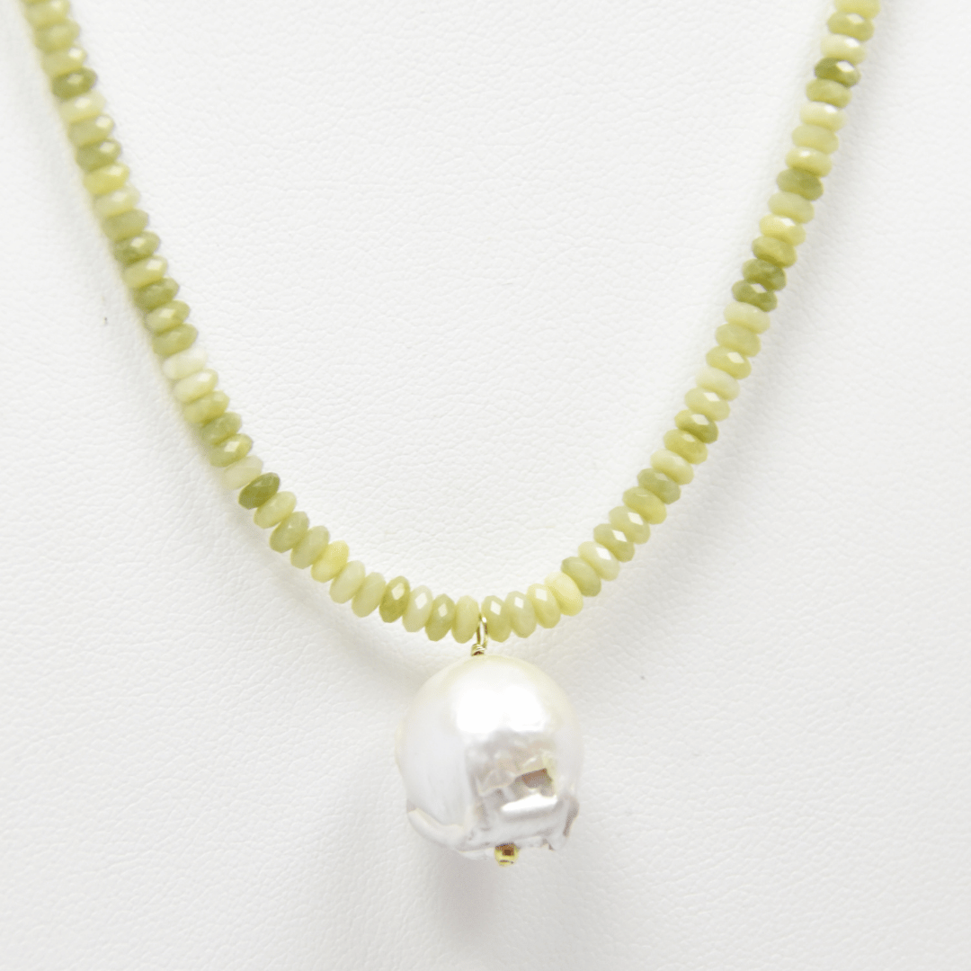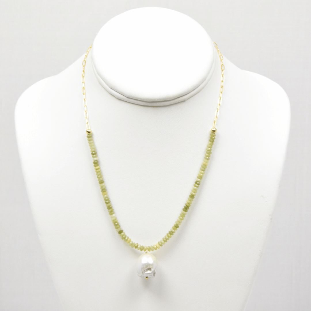 4mm Mustard Green Jade beads paired with paperclip chain and a large baroque pearl drop.