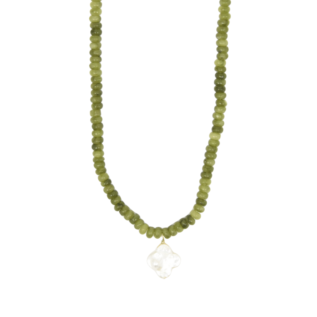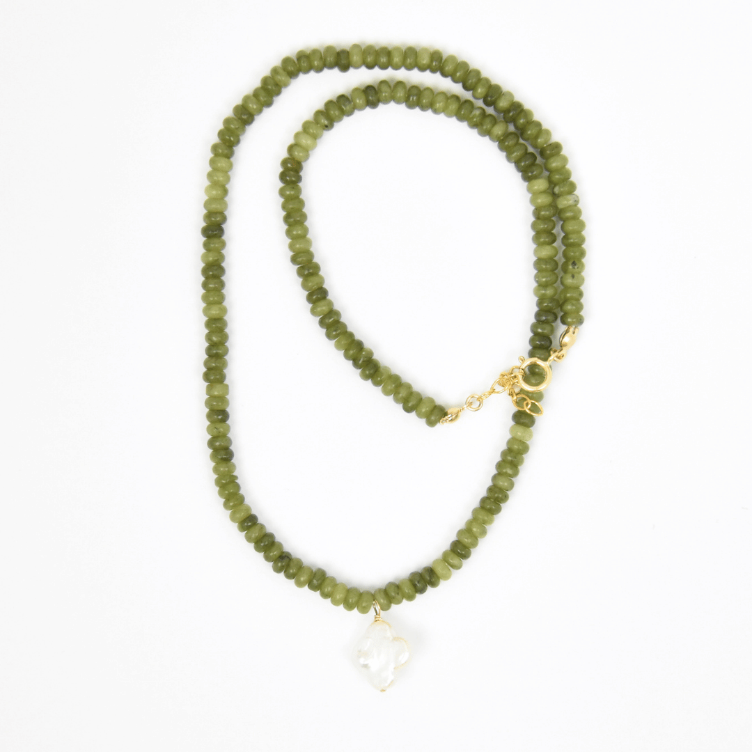 4mm Serpentine Green Jade rondelles with a 12mm freshwater pearl clover pendant.