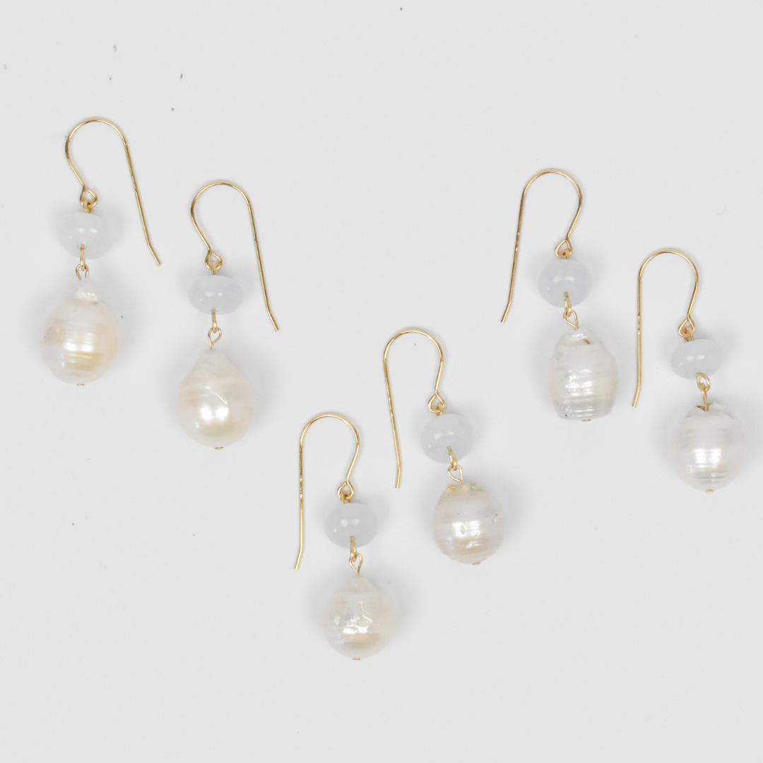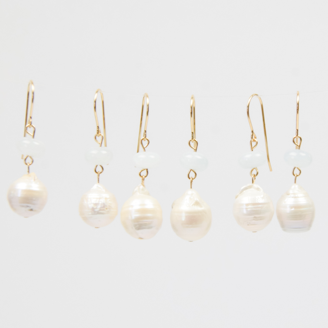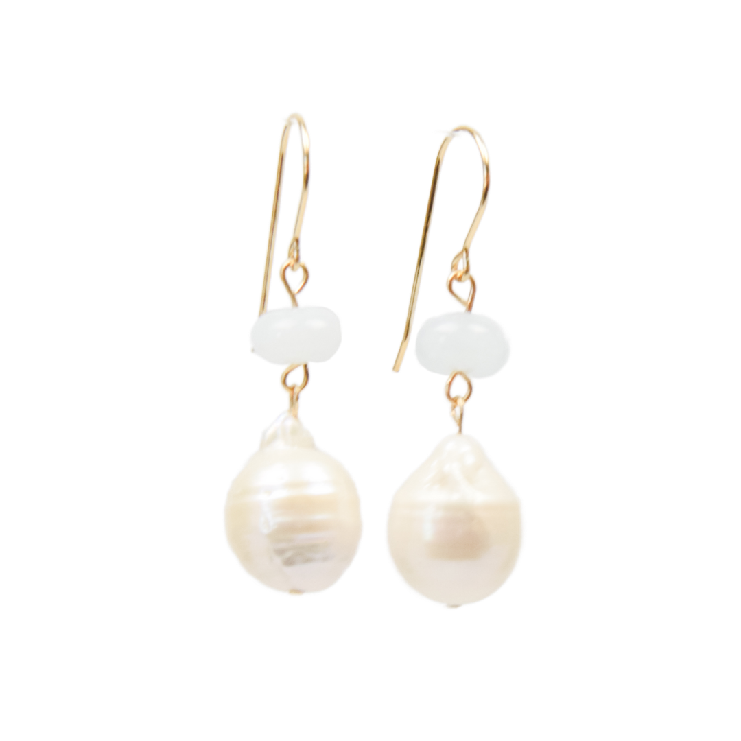 12-13mm large white baroque freshwater pearl with a 7-8mm Columbia Blue Quartz smooth rondelle on French ear wire hook.