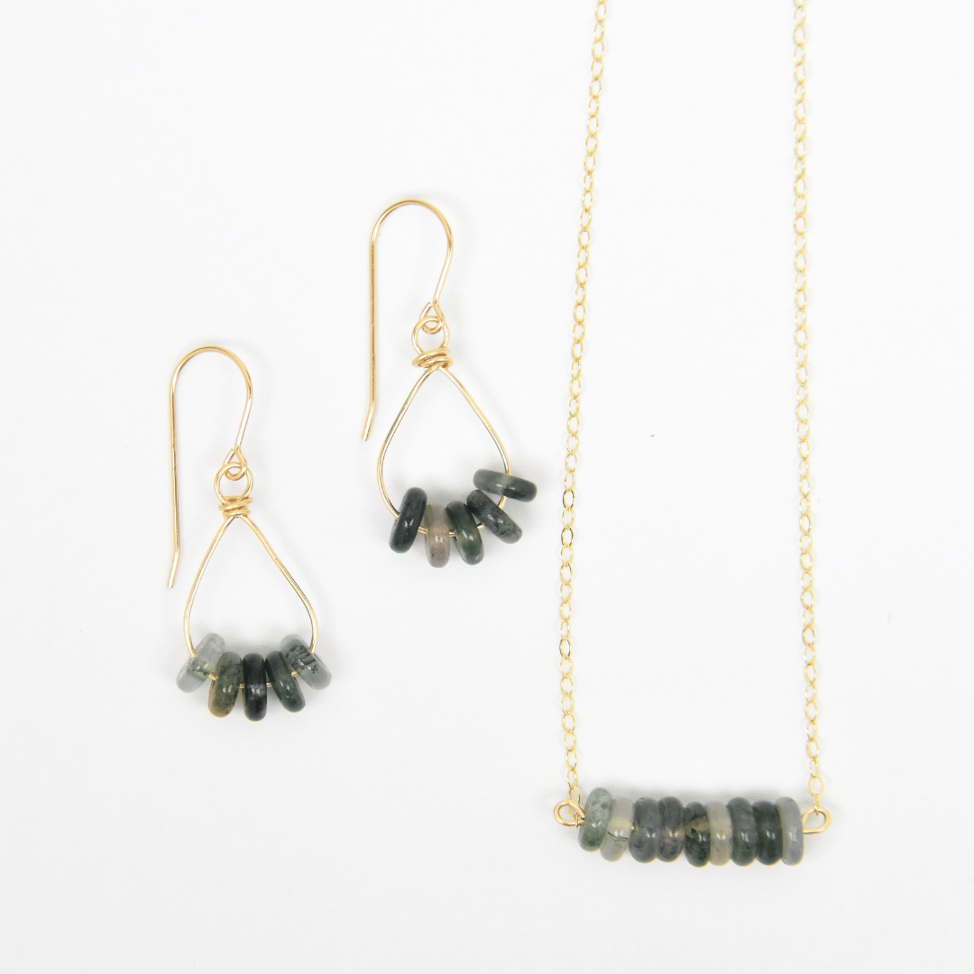 8mm Green Moss Agate thin rondelles on a 14k gold filled wire teardrop.