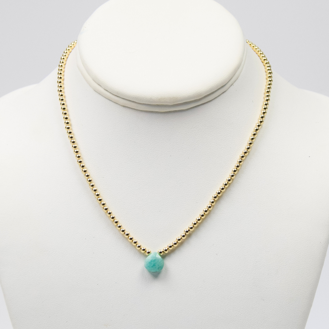 3mm beaded 14-16" necklace with single 9-10mm natural Amazonite faceted teardrop bead with 2" extending chain and spring ring closure.