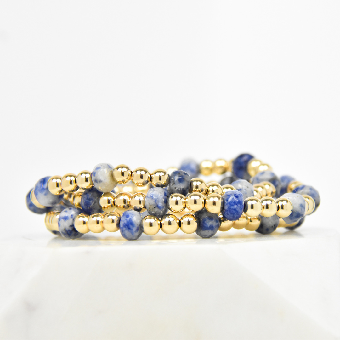 6mm Sodalite faceted Rondelle alternating with 5mm 14k gold filled beads on elastic for ease.